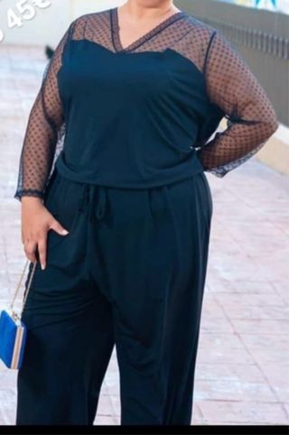 Elegante mono largo de color negro. Presenta un diseño con mangas y escote en tejido de transparencias con pequeños topos. - Mangas largas de tul con lunares. - Escote en V con detalle de encaje. - Cintura con cordón ajustable. - Pantalón de corte ancho. Medida de axila a axila 78 cm.