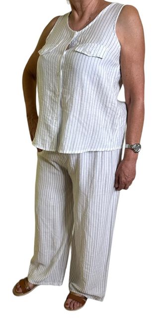 Conjunto de blusa chaleco con pantalón, color blanco con rayas en azul Tallas desde la 40 hasta la 44 La mujer que sale en foto tiene una talla 42.