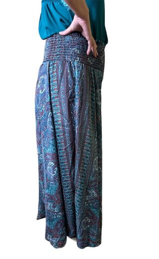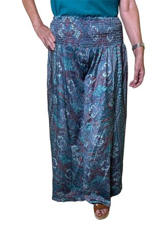 Pantalón fluido tipo seda satén con mucho vuelo. Parece una falda lleva en la cintura elástico en panal de abeja da mucho talla. La modelo de la foto tiene una talla 42. Da talla desde la 40 hasta 52.