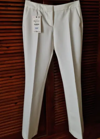 Pantalón recto, ligeramente flare, color blanco roto. Tiro alto, bolsillos delanteros y falsos bolsillos detrás. Cierre con cremallera, botón interior y gancho. Talla XS/34. Composición: 74 % poliéster, 19 % viscosa y 7% elastano. Tacto suave y agradable. Largo medido en la cadera, 97 cm. Sin estrenar. Con etiqueta.