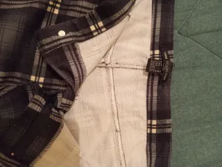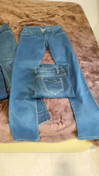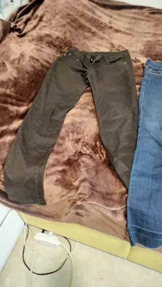 Lote compuesto por 3 prendas (2 pantalones talla 38 de mujer y una chaqueta estilo vintage talla L unisex), todo en muy buen estado. Los pantalones son marca Koyote el de la izquierda y marca Aninoto el de la derecha (este ultimo con estampado dibujado sobre relieve. La chaqueta es marca T&K jeans.
