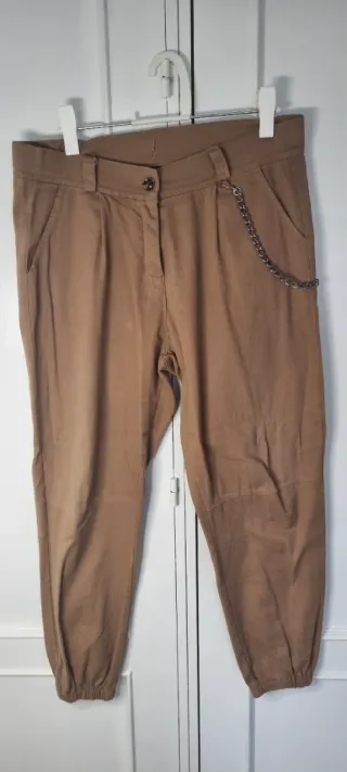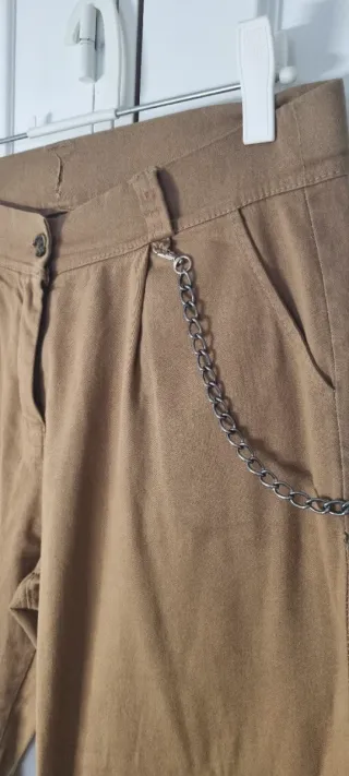 Pantalón estilo cargo en color camel, con un detalle de cadena. - Cintura con trabillas. - Cierre de botón y cremallera. - Bolsillos laterales. - Cadena decorativa en el lateral.