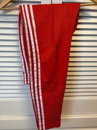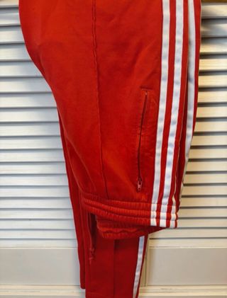Pantalón rojo de chándal, marca Adidas. Es muy cómodo, tiene alguna marca del uso, pero está en muy buen estado. Es elástico, uso una S/M de mujer y me queda bien.