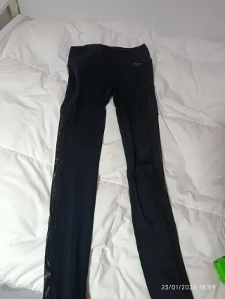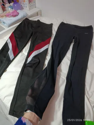 Conjunto de dos mallas deportivas para mujer, ideales para entrenar o para el día a día. Las dos son talla S/M - Malla negra con detalles en rojo y blanco. - Malla negra con detalles de malla que transparenta. - Diseño moderno y cómodo.