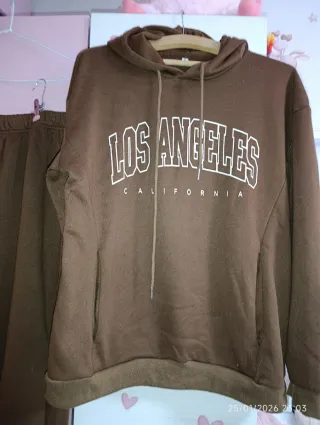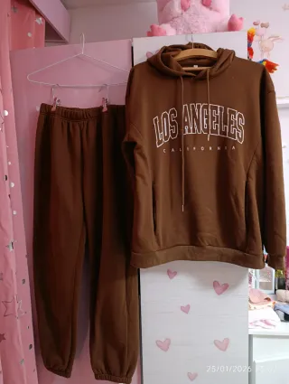 Conjunto de chándal con diseño Los Angeles California.color marrón chocolate Usado pero en muy buen estado, abriga muchísimo y es súper comodo, talla XL hay medidas en las fotos - Sudadera con capucha. - Pantalón de chándal. - Estampado Los Angeles California en la sudadera.