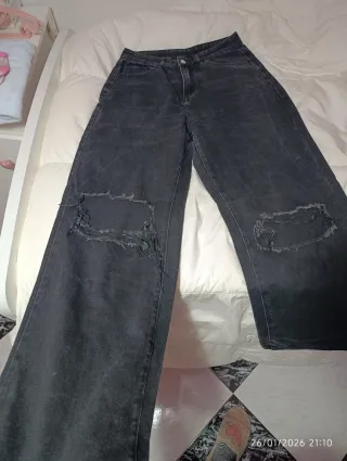 Pantalones vaqueros de corte ancho con un diseño moderno y desgastado. Son cómodos y versátiles. Talla L, no son nada elásticos por lo que no dan mucha talla, hay medidas en las fotos - Tiro alto. - Piernas anchas. - Detalle de rotos en las rodillas.
