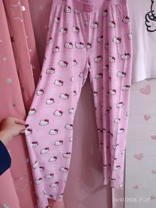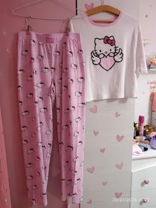 Conjunto de pijama con estampado de Hello Kitty. el pantalón es de pata ancha y lleva goma en la cintura, marca talla S de Primark (38-40) hay medidas en las fotos y la parte de arriba es talla 2XL ya que la quería oversize aunque al final no lo llegué ni a usar.. hay medidas en las fotos - Camiseta de manga corta. - Pantalón largo. - Diseño divertido y juvenil.