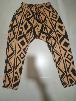 Pantalón baggy con un llamativo estampado geométrico y un acabado satinado. - Diseño holgado y cómodo. - Cintura ajustable con cordón. - Estampado tribal en beige y negro. - Tejido ligero y fluido.