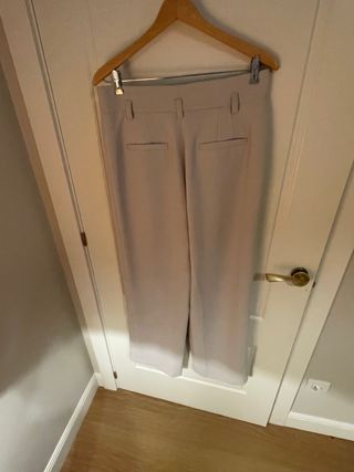 Pantalones de vestir de corte recto y tiro alto Pantalon de traje Tiene bolsillos Color beige Marca Stradivarius Tiro alto Usado solo un par de veces Está nuevo Talla 34 - Cintura alta con trabillas para cinturón. - Cierre de botón y cremallera. - Bolsillos laterales. - Pinzas delanteras.