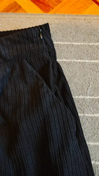 Pantalón de pana en color negro, talla M. Nuevo sin estrenar. - Tejido acanalado. - Corte ancho en las piernas. - bolsillos a los lados. - cremallera lateral. - 36 cm aproximadamente de cintura. Entrego en mano y hago envíos.