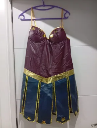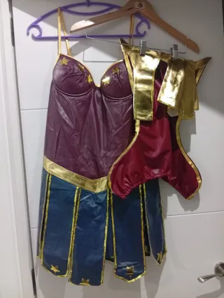 Disfraz inspirado en la Mujer Maravilla. Cosplay, talla XL - Diseño de corpiño con estrellas doradas. El traje tiene pantalón debajo - Falda con detalles de lentejuelas doradas. - cubreboras, cinta cabeza, cinto