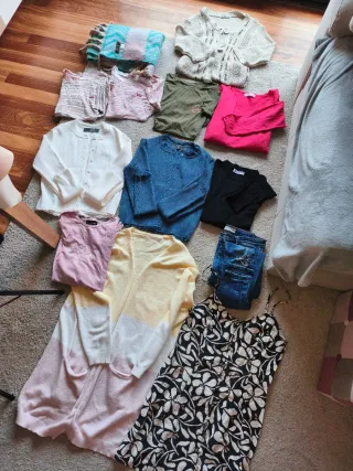 Conjunto de prendas de vestir para mujer. Tallas: S,M - Variedad de estilos y colores. - Incluye tops, cárdigans y pantalones.