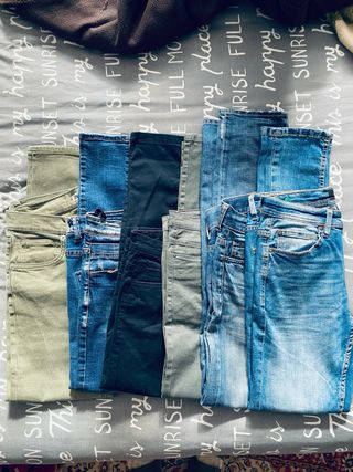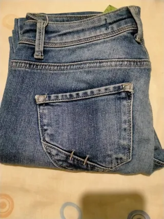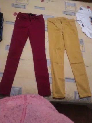- Un pantalón vaquero de color azul claro de Zara bootcut de pierna corta, 67 cm de pierna por el interior. Talla 32 aunque talla para una 34. - Un jeggin color crema de Tezenis.Talla S. Muy cómodo. Los dos en buen estado, poco uso.