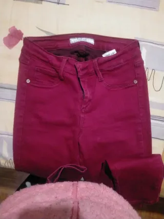 Pantalón rojo de Bershka, corte pitillo/skinny. Muy favorecedor y cómodo. Tiene abertura en el bajo que le da un toque moderno.Apenas usado como nuevo.Talla 36 Precio 5€