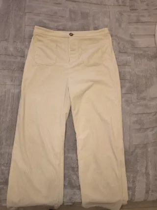 Pantalones de vestir de la marca Elisa Ribera en color marfil. Son muy anchos y cintura alta para llevar con cinturón fino. Consigue un efecto muy reductor y elegante Tela con mucha caida. Bolsillos laterales. - Cierre de cremallera y botón. Hago descuentos si compras mas cosas de mi colccion