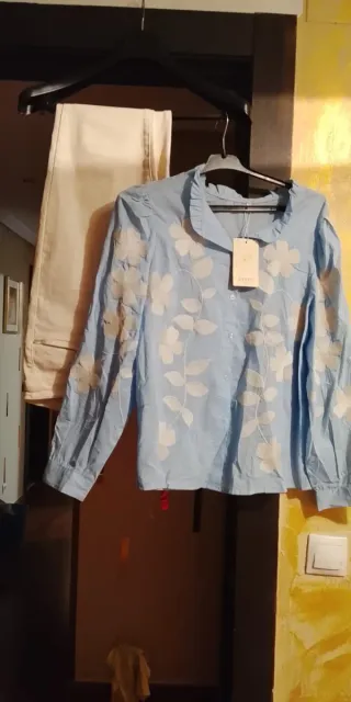 Conjunto de mujer que incluye pantalón y blusa Local - Blusa azul con estampado floral.talla L - Pantalón de color beige. Elástico