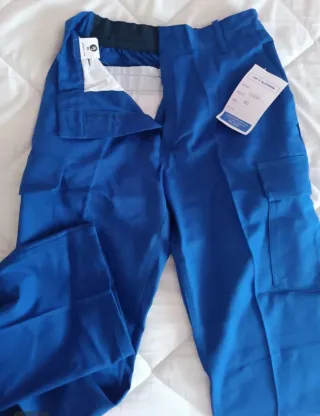 2 Pantalones de trabajo de color azul, talla 40. - Cierre de cremallera y botón. - Dos bolsillos laterales. - Bolsillos cargo en los laterales de los muslos. - Cintura elástica en la parte trasera.