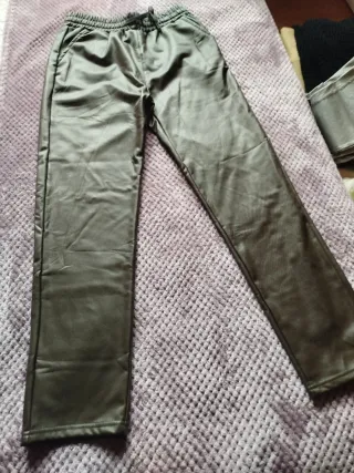 Pantalones de efecto piel en color negro. Son cómodos y versátiles. - Cintura elástica. - Tejido con acabado brillante.