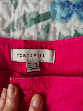 Pantalón vaquero de mujer en un llamativo color coral. Su tejido elástico ofrece comodidad. Ideal primavera-verano, también vale para una talla XS - Tiro corto - Cierre de botón y cremallera. - Bolsillos delanteros y traseros. - Costuras reforzadas.