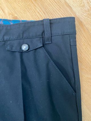 Pantalón de la marca Miss Sixty en color negro. Presenta un diseño moderno y versátil. - Talla 32. - Forro interior con estampado floral en tonos azules y grises.