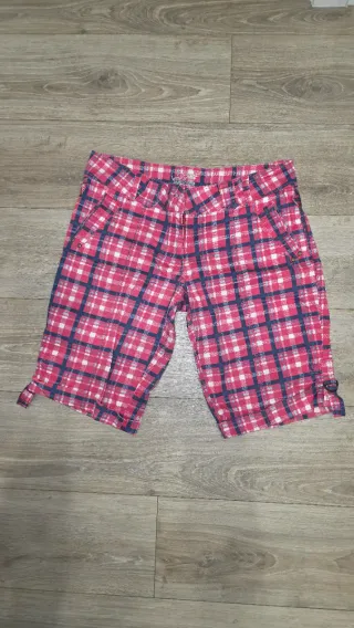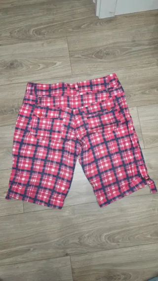 Bermudas de cuadros en tonos rosas, blancos y azules. Tienen un diseño moderno y son cómodas y ligeras. Corte tipo jeans y son ajustables en altura. Talla L - Cintura con trabillas para cinturón. - Bolsillos laterales y traseros.