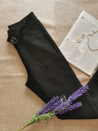 Elegantes pantalones de vestir negros, perfectos para cualquier ocasión formal o casual. - Diseño clásico y atemporal. - Detalle metálico en la cintura.