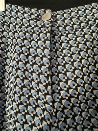 Pantalón con estampado geométrico. - Diseño con figuras geométricas. - Cintura con cierre de botón y cremallera. Se adapta muy bien porque tiene goma. Puesto en tan solo una ocasion. Es muy estiloso. Envio maximo en 24h