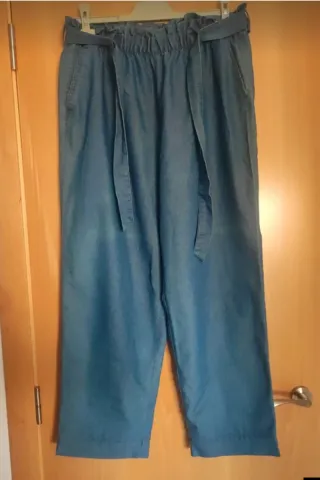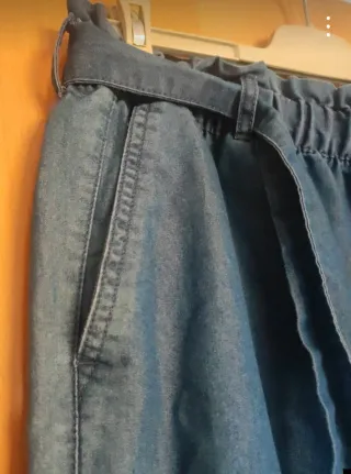 Pantalón vaquero fino con cinturón. - Tejido ligero. - Cintura elástica con lazada. - Bolsillos laterales.