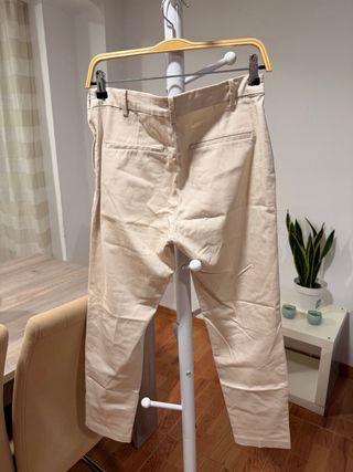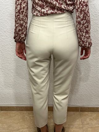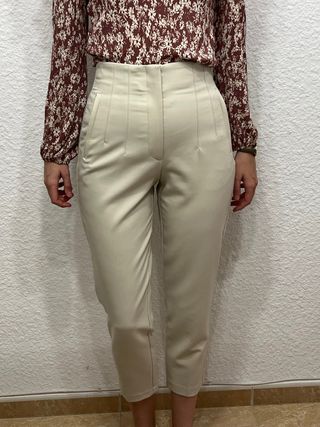 Pantalón de pinzas de Zara, talla S, de mujer, color crema o beige. Con bolsillos delanteros falsos y de tiro alto. Cómodos e ideales para ir a la oficina o arreglarse. La tela es gruesa, no se estira y queda fenomenal. Está como nuevo, en perfectísimo estado. 📏 Medidas: - Largo 97 cm - Tiro 31 cm - Cintura 33 cm La chica de la foto mide 1,83 m. Material: - 72% poliéster - 21% viscosa - 7% elastano
