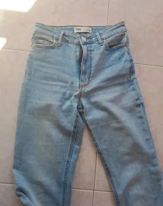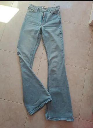 Pantalón vaquero de campana de la marca Zara. - Corte acampanado. - Tiro alto. - Lavado claro.