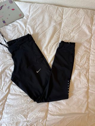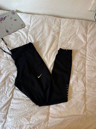 Pantalones deportivos Nike negros, ideales para entrenar. - Logo de Nike en blanco. - Detalles reflectantes en los tobillos. - Cremalleras en los bajos. - Cintura elástica con cordón.