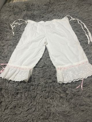 Pantaloncillos blancos con detalles de encaje y lazos. - Encaje floral en los bajos. - Lazos de satén rosa en los laterales. - Cintura elástica con cordón.