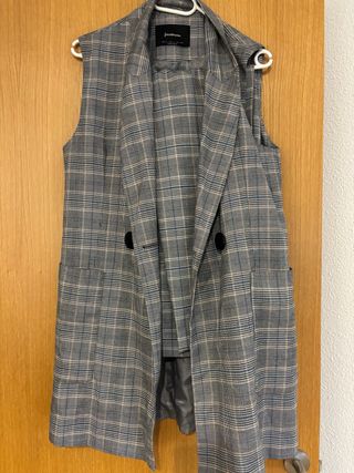 Conjunto de dos piezas de Stradivarius. - Chaleco largo de cuadros. Talla L - Pantalón a juego talla XL - Diseño de cuadros en tonos grises y azules.