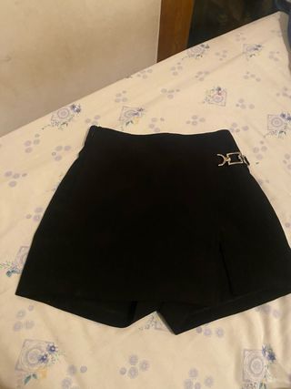 Falda pantalón de color negro con un diseño moderno y elegante. - Detalle de hebilla metálica en la cintura. - Abertura lateral en la falda. - Cremallera lateral para cierre.