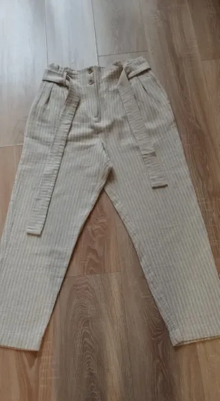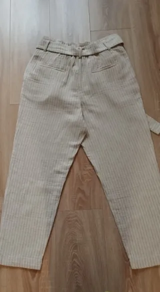 Pantalones de vestir en color beige, con un diseño elegante y moderno. - Cinturón a juego incluido. - Raya vertical fina. - Cierre con botones y cremallera. - Bolsillos laterales.