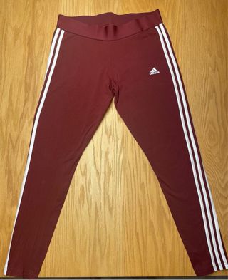 Mallas largas deportivas de la marca Adidas para mujer, talla L. - Diseño con las tres rayas clásicas de Adidas a los lados. - Cintura elástica para un ajuste cómodo. - Color burdeos intenso.