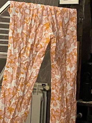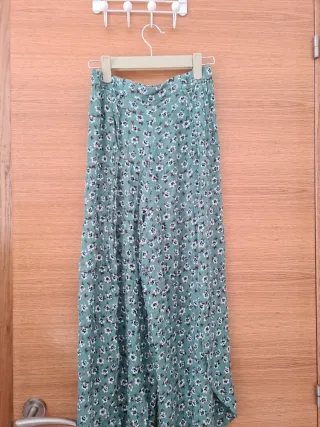 SOLO DISPONIBLE HASTA EL 8 DE FEBRERO SINO SE DONARÁ A ASOCIACIÓN. Pantalón largo de verano con un bonito estampado floral. Su diseño ligero y con aberturas laterales lo hace ideal para los días cálidos. - Estampado floral multicolor sobre fondo verde. - Aberturas laterales en el bajo. Se negocia precio siempre que se adquiera otro producto.