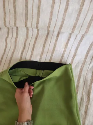 Pantalones verdes tiro alto con cintura elástica y cremallera "invisible" lateral. Super favorecedores, ceñidos por la zona de glúteo cadera, rectos por màs abajo. A penas usados. No me acuerdo de qué tienda.