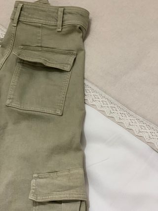 Pantalón de estilo cargo en color beige, con detalles modernos. - Cintura con trabillas y botón. - Bolsillos delanteros. - Cadena decorativa en el lateral. - Puños elásticos en los tobillos. Son una 34 pero tallan como una 38.