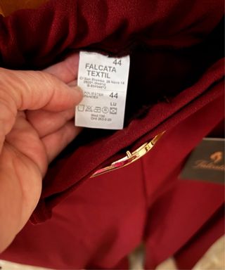 Pantalón elegante de color burdeos con un diseño moderno. - Detalles dorado en la cintura. - Corte ancho y fluido.