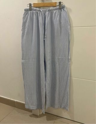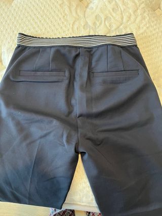 Pantalón de Zara en color azul marino, talla S. Como nuevo. - Cintura elástica con detalle de rayas. - Dos bolsillos traseros.