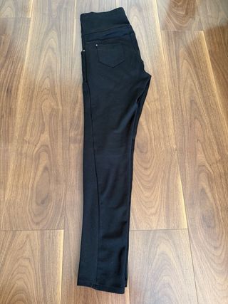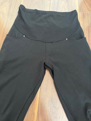 Pantalón de premamá en color negro. - Cintura alta elástica. - Bolsillos delanteros. - Detalle de remaches dorados en los bolsillos. -Son tipo leggin pero de tejido fuerte que no se marca ni transparenta nada Super cómodos!!!