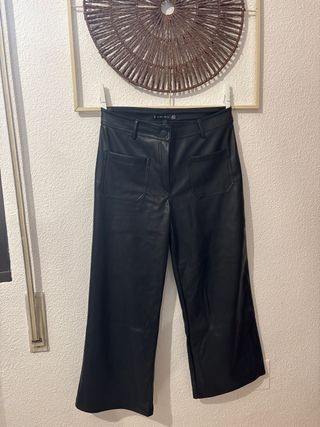 Pantalón de corte ancho confeccionado en material similar al cuero. - Diseño de cinco bolsillos. - Cierre de botón y cremallera. - Cintura alta.