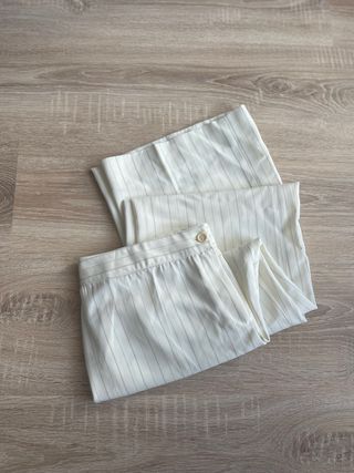 Conjunto de dos prendas: un pantalón y un top. - Top sin mangas con cuello en V y botones. - Pantalón de pierna ancha con cintura elástica, talla S pero es más bien M.