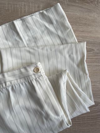 Pantalones de traje elegantes con un diseño de rayas verticales. - Color blanco con finas rayas. - Cierre de botón.
