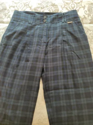 Pantalón de vestir con un diseño a cuadros clásico. Ideal para un look elegante. - Cintura con trabillas para cinturón. - Cierre de cremallera y botón. - Bolsillos laterales. Talla 42. Marca amisu. Es un poco elástico. Totalmente nuevo sin etiquetas. Nunca se usó.