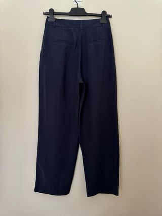 Pantalón azul marino de corte recto con pinzas delanteras. Es de Lefties. Medidas: cintura 70cm, cadera 108cm, largo 94cm, ancho de bajo 21cm. Tallado como 34, pero da para 36/38, revisar medidas.