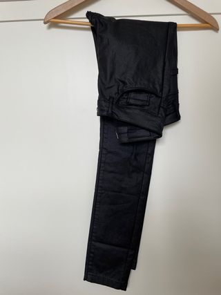 Pantalón pitillo encerado de color negro, con bolsillos en la parte delantera y trasera.