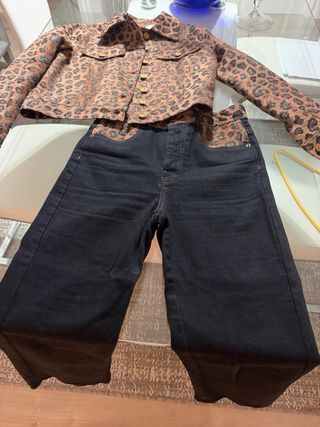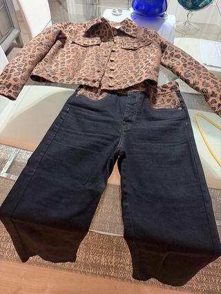 Conjunto de pantalón y chaqueta de Scalpers con un llamativo estampado, el pantalon es talla 36 y la cazadora es talla Xs, lo he puesto 1 vez, practicamente nuevo, comprado hace poco, es ideal y actual - Chaqueta corta con botones dorados. - Pantalón ancho. - Usado una sola vez.