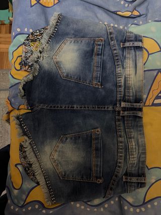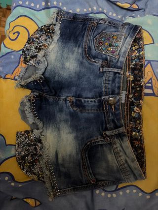 Shorts vaqueros para mujer con un diseño único y detalles llamativos. - Parches de tela floral en los laterales. - Adornos de pedrería y abalorios en los bolsillos. - Bajo deshilachado con detalles de pedrería.